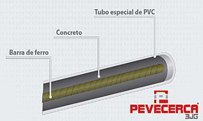 Os produtos PEVECERCA 3JG são compostos por acessórios e diferentes perfis (tubos): redondos, quadrados e retangulares. Possuem diferentes tamanhos e bitolas, formando vários modelos de cercas, portões, corrimãos, sacadas, guarda corpo, delimitações de áreas entre outras aplicações e soluções das mais variadas áreas e segmentos. Os perfis são modulares vazados e acoplados entre si por meio de encaixes. Após a montagem os perfis/tubos, são preenchidos com concreto e ferro onde as fôrmas de PVC de alta resistência ficam incorporadas cumprindo as funções de acabamento, revestimento e proteção. São resistentes à impactos e possibilitam a fixação de objetos e acessórios.